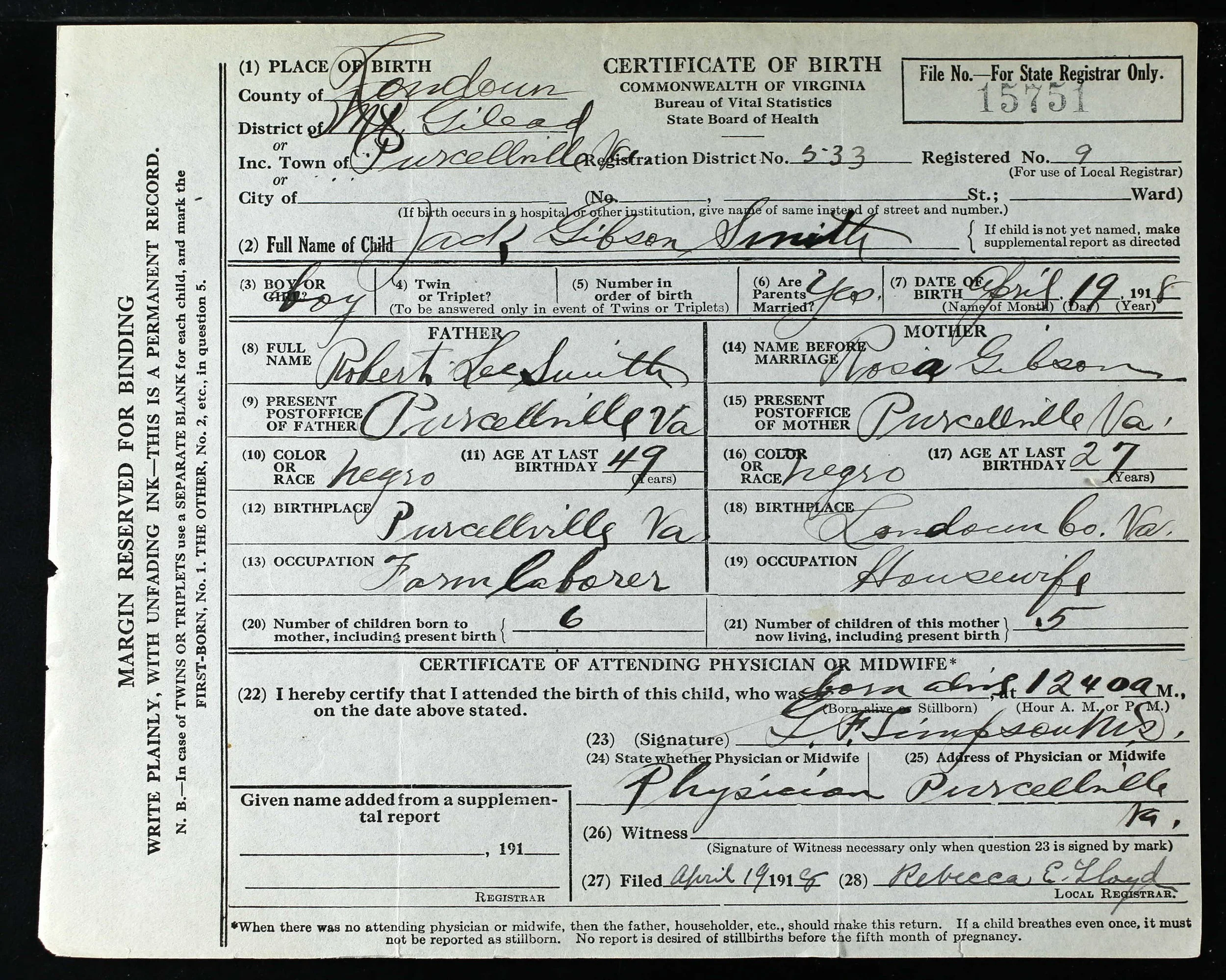 His mother is listed as Rosa Gibson—Negro, 25 years old at last birthday, born in Loudoun County, Virginia, housewife and resident of Purcellville, Loudoun County, Virginia.